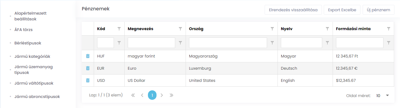 A pénznemek oldalon a felvett pénznemek listája látható. Ezeket be lehet állítani alapértelmezett pénznemnek az alapértelmezett beállításokban. Módosítani nem lehet őket, csak törölni vagy újat felvenni. Csak azt a pénznemet törölhetjük amelyik nem alapértelmezett vagy nincs használatban.